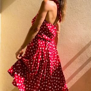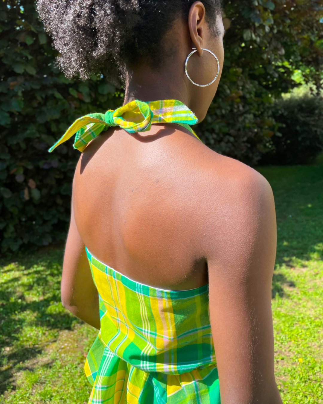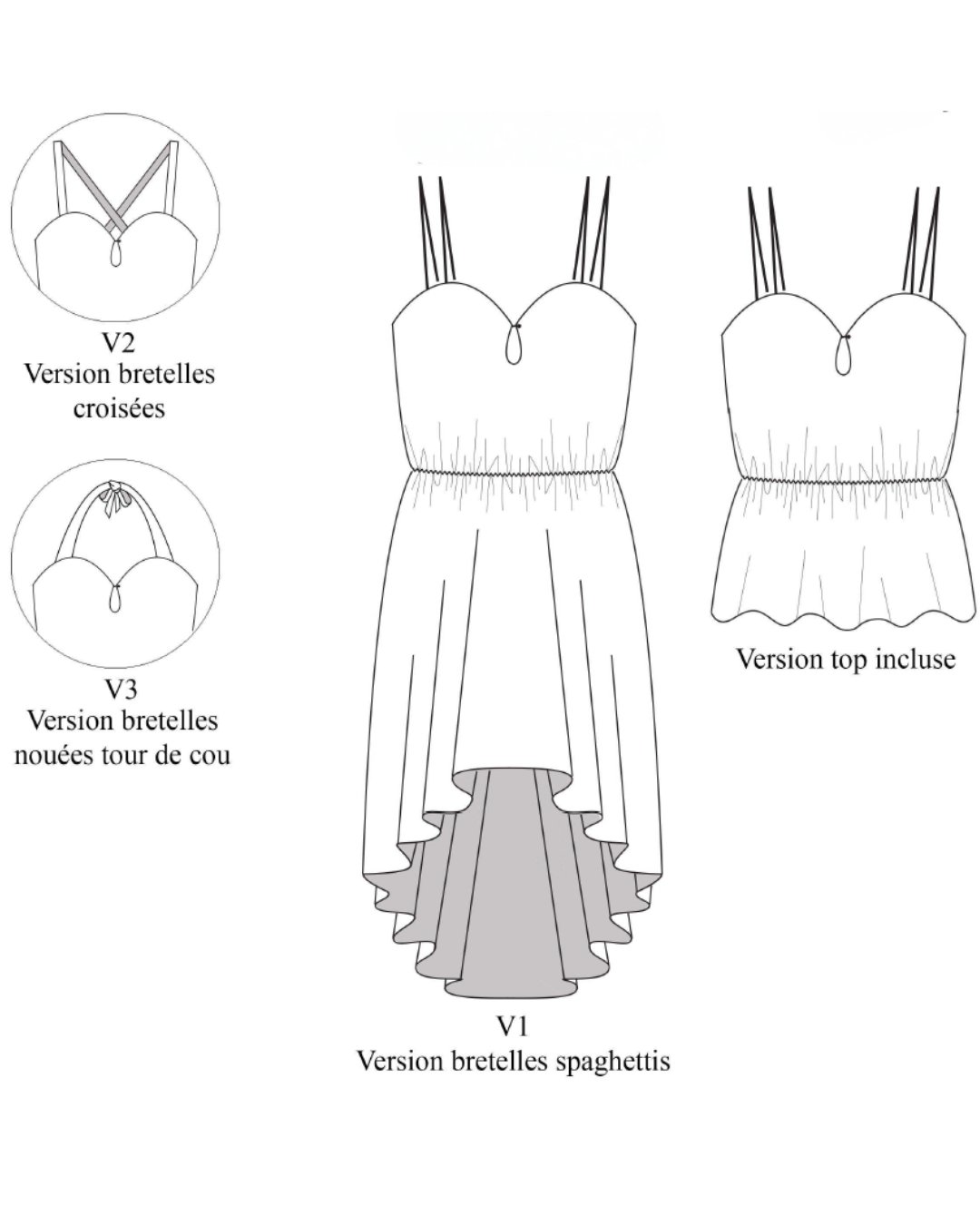 - Trois options de bretelles : spaghettis (V1), larges croisées dans le dos (V2), nouées tour de cou (V3)