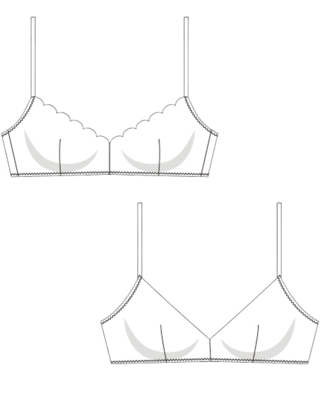 Les marges de couture sont incluses dans le patron : 5 mm pour les coutures d’assemblage, 1 cm pour les coutures avec élastiques et agrafage, et 0 mm sur le bord de la dentelle.