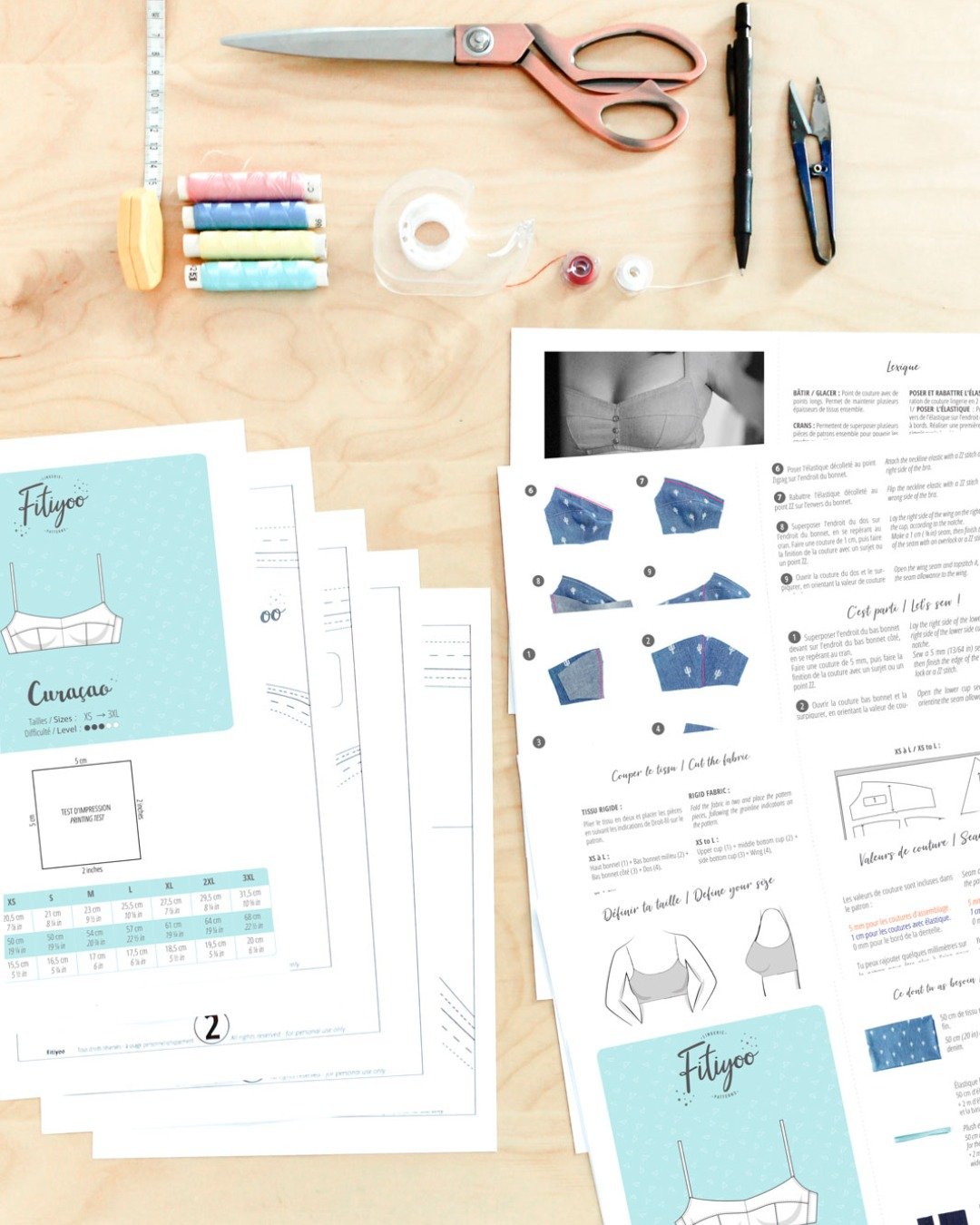 Le niveau de difficulté est intermédiaire : le montage reste progressif et bien guidé, mais le modèle demande de la précision dans l’assemblage des bonnets, la pose des élastiques lingerie et les finitions. Le patron couvre une large amplitude de tailles, du XS au 3XL, soit du 80A au 110F/110G selon les correspondances du modèle.
