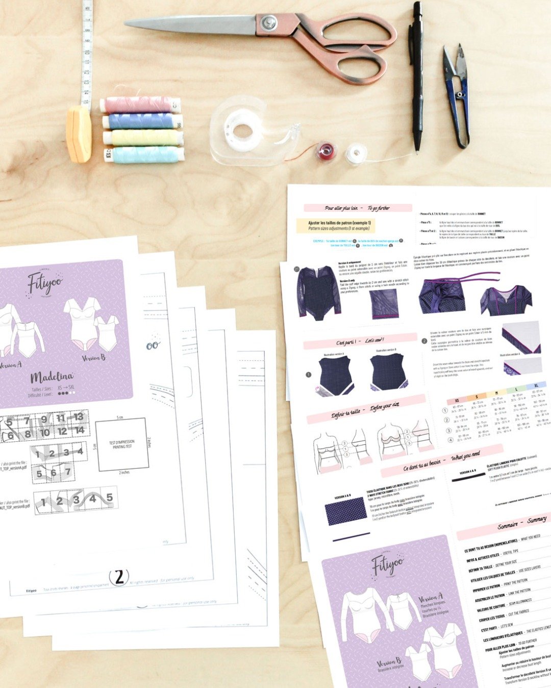 - Version A : prévoir 1 m supplémentaire de tissu stretch pour manches, décolletés et cuisses dos.
