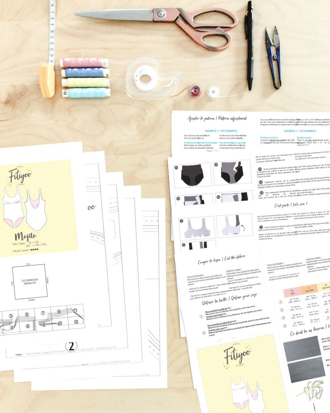 - Possibilité d’ajuster le patron si les mesures de bonnet, taille et bassin correspondent à des tailles différentes.