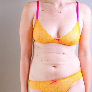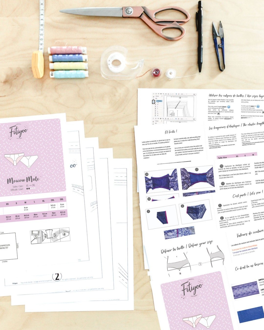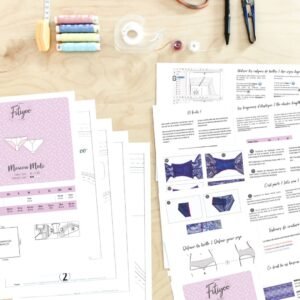 Le niveau de difficulté est accessible à une couturière déjà un peu à l’aise avec les matières extensibles, mais le modèle reste très motivant pour progresser en lingerie. Les coutures d’assemblage en 5 mm demandent un peu de précision ; il peut être utile d’ajouter temporairement 5 mm sur le patron pour plus de confort de couture, puis de recouper ensuite. Le patron prévoit également des repères de montage clairs, un guide détaillé, ainsi qu’un tableau de longueurs d’élastiques par taille pour faciliter la préparation du modèle.