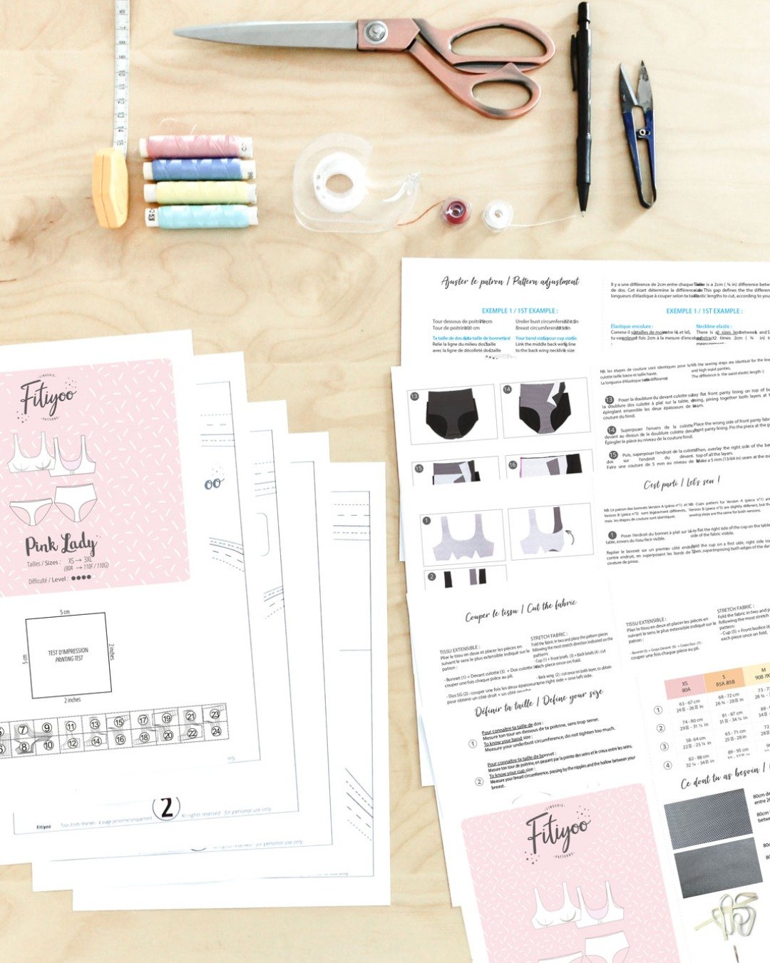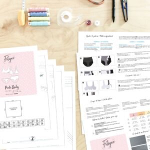 Les marges de couture sont incluses dans le patron : 5 mm pour les coutures d’assemblage, 1 cm pour les coutures avec laminette, et 2 cm au milieu dos du soutien-gorge pour la pose de la fermeture clips.