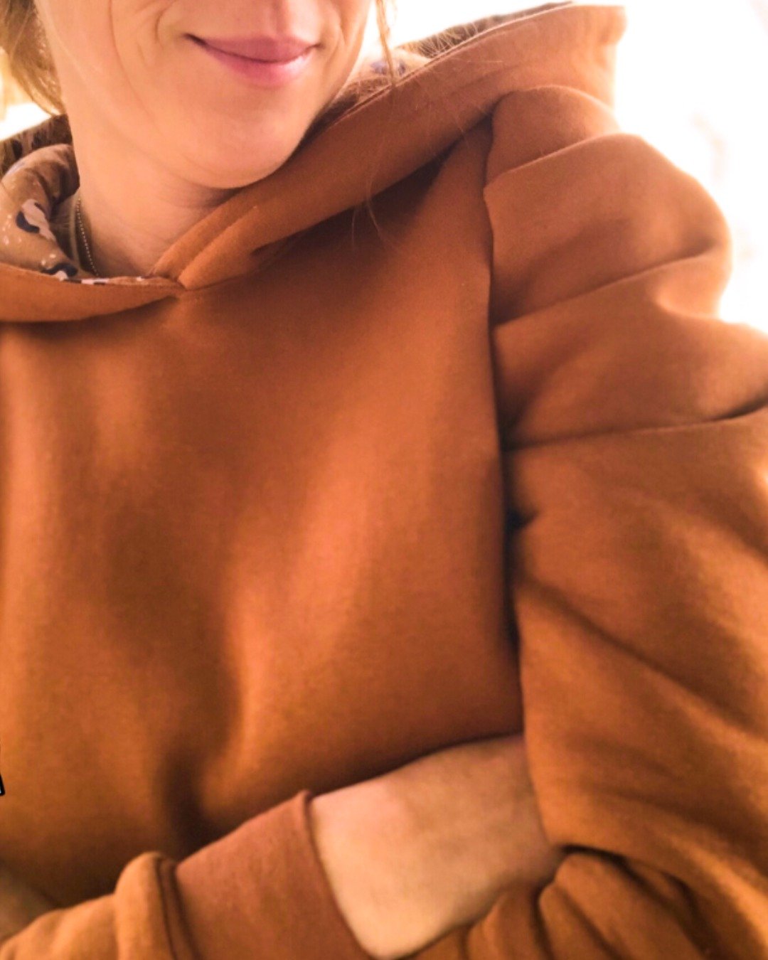 - Avec capuche : ajouter 50 cm de tissu (laize 140 cm)