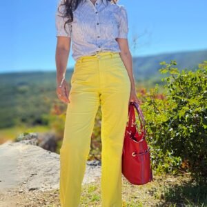 Lyria est un pantalon élégant et polyvalent, conçu pour accompagner le quotidien avec style. Sa coupe droite légèrement évasée à partir du genou allonge subtilement la silhouette, tandis que sa taille haute et ses poches bien pensées en font une pièce aussi flatteuse que fonctionnelle. Le patron propose également une version short à revers, idéale pour les beaux jours.
