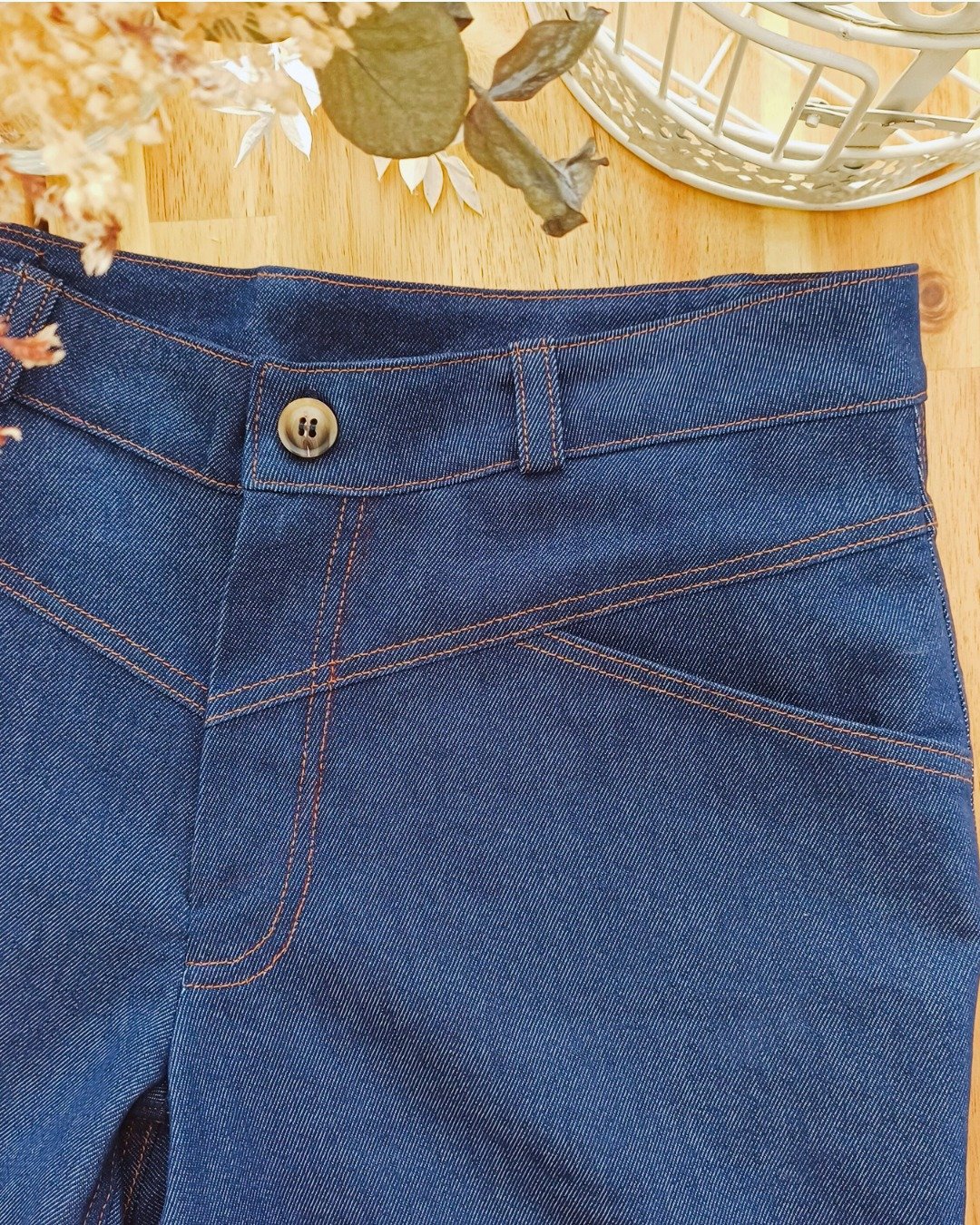 Tissus chaîne et trame avec de la tenue : denim, gabardine, chino, velours côtelé. Pour une version plus fluide : lin moyen, tencel épais, lainage fin. Une pointe d’élasthanne (1 à 2 %) est possible pour plus de confort.