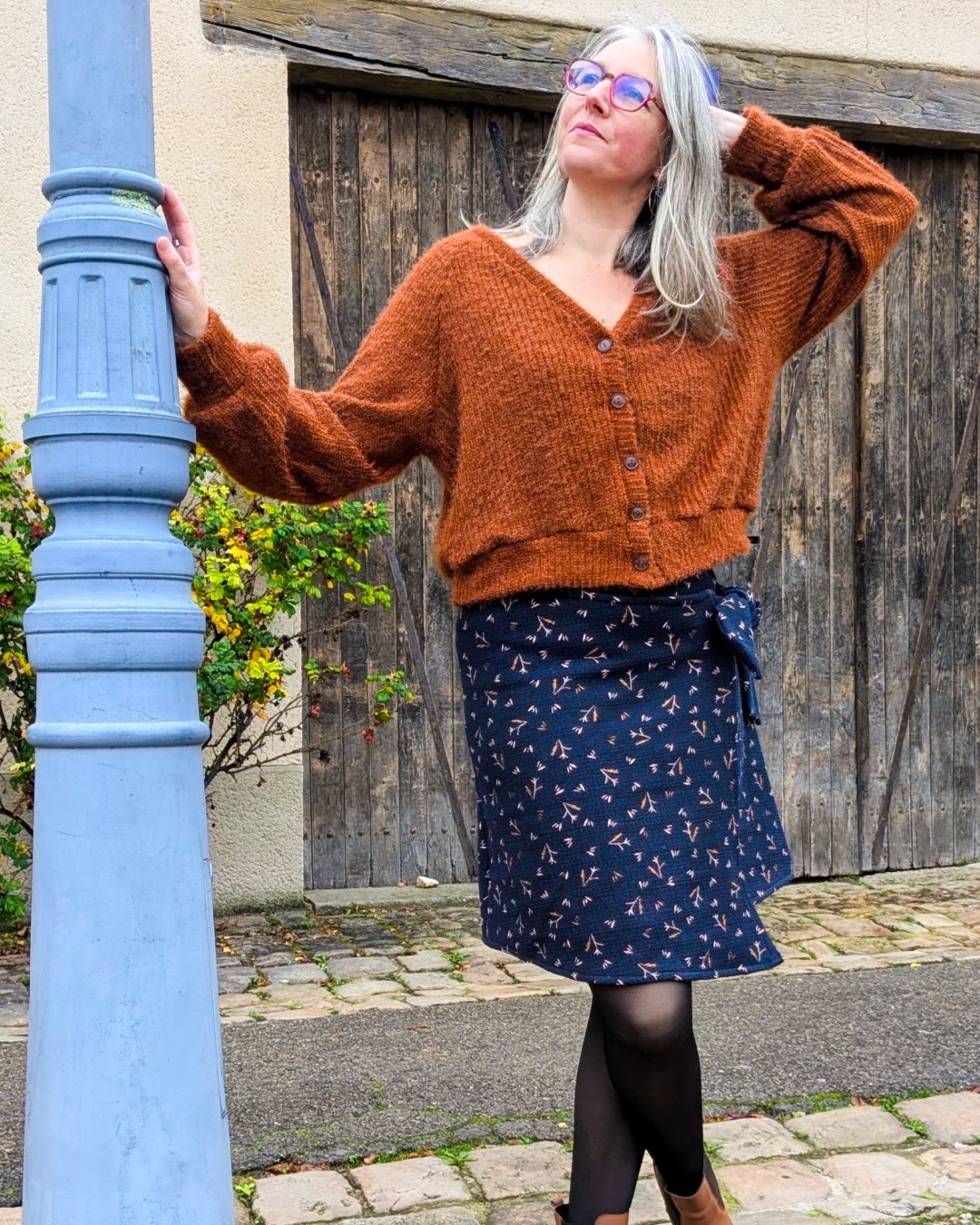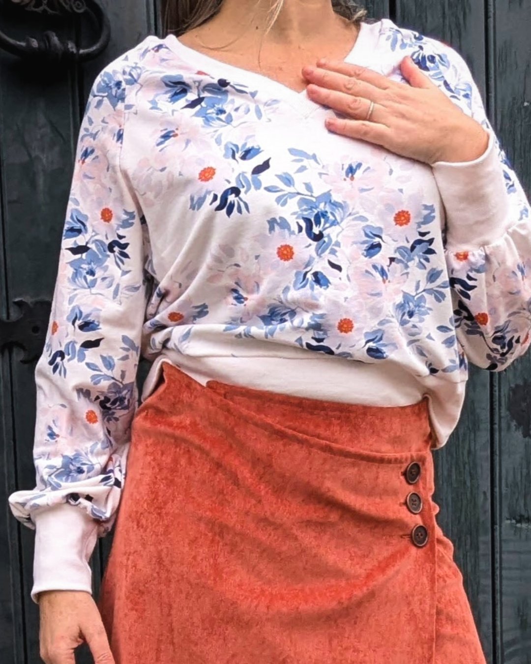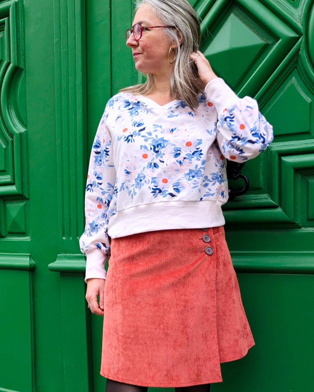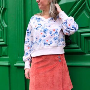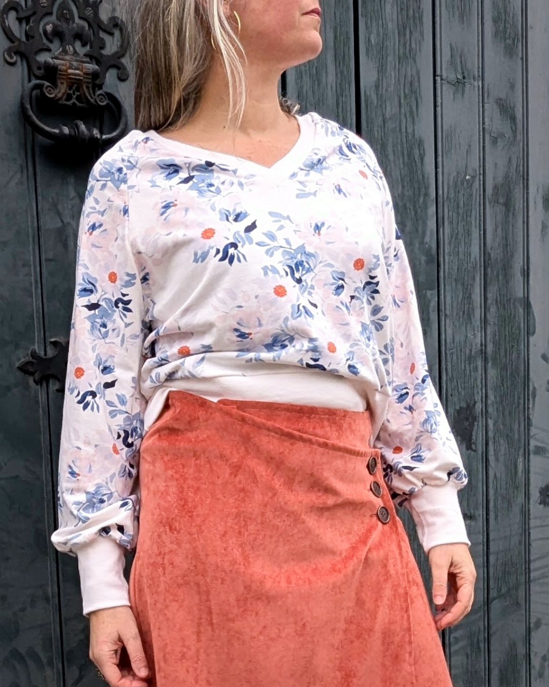 Les principales étapes techniques résident dans la pose du col en V et des poignets froncés. Il est conseillé de commencer avec un tissu stable si vous débutez en couture maille.
