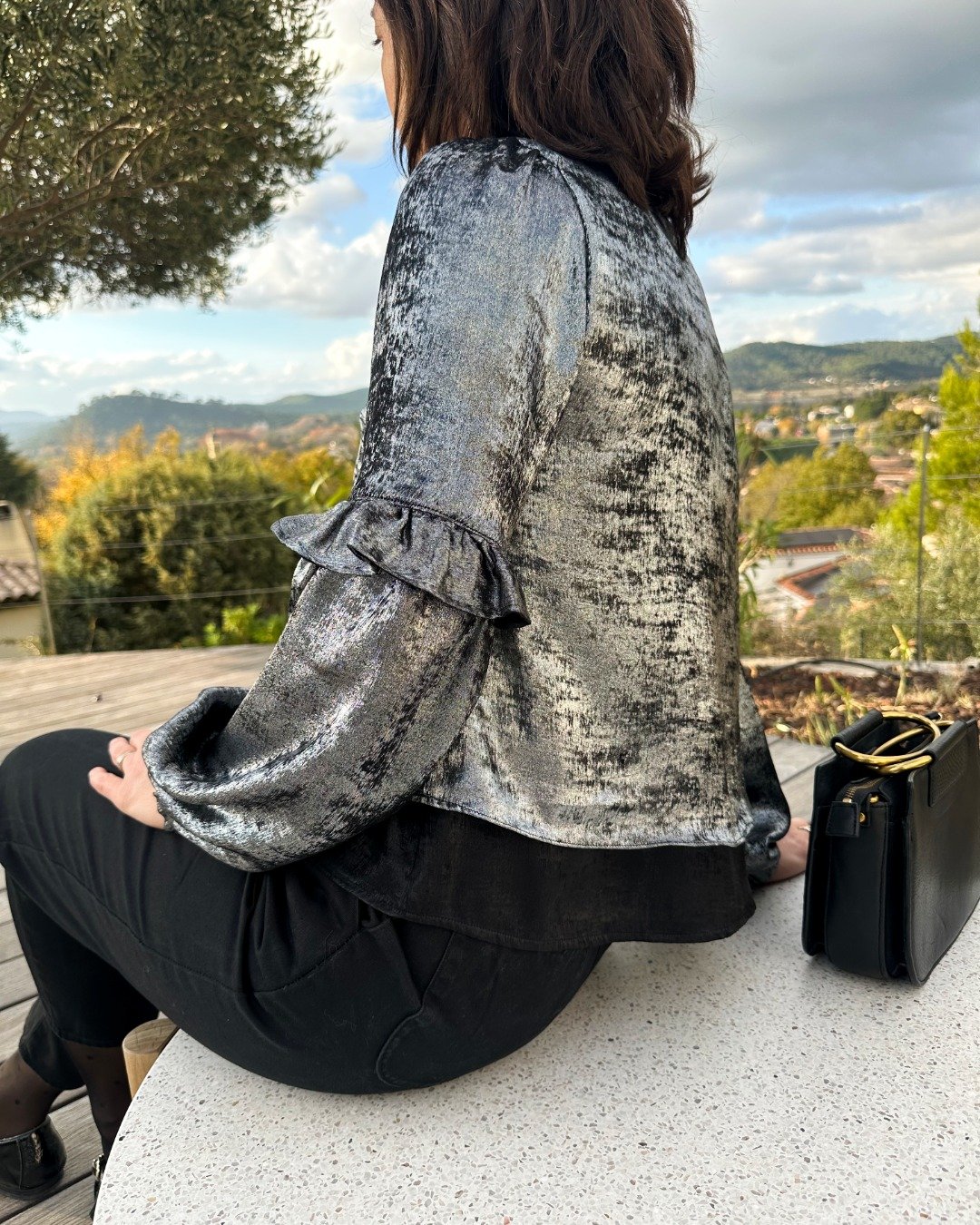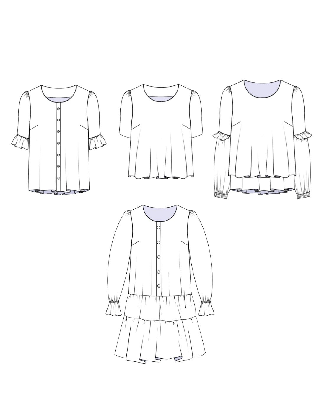 Azurée est une blouse ou robe élégante, pensée pour s’adapter à toutes les saisons et morphologies grâce à sa coupe évasée et ses nombreuses déclinaisons. Accessible aux débutantes comme aux couturières plus aguerries, elle propose un jeu subtil de superpositions, de volants et de fronces. L’encolure ronde dégagée apporte une touche intemporelle, tandis que les manches et finitions personnalisables vous permettent de créer une pièce unique à votre image.