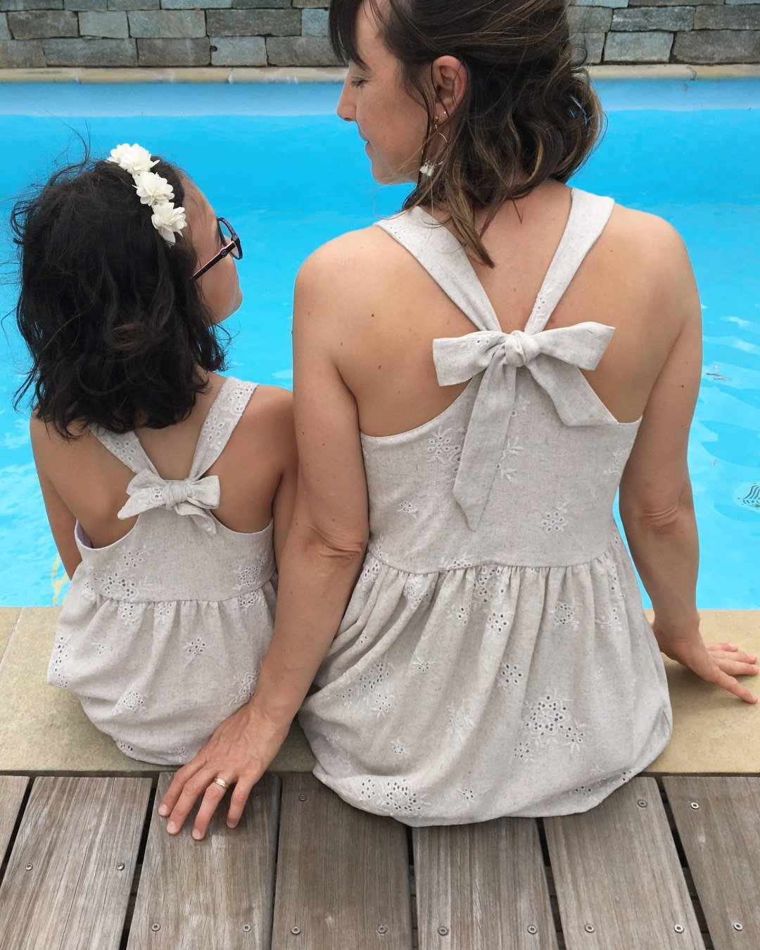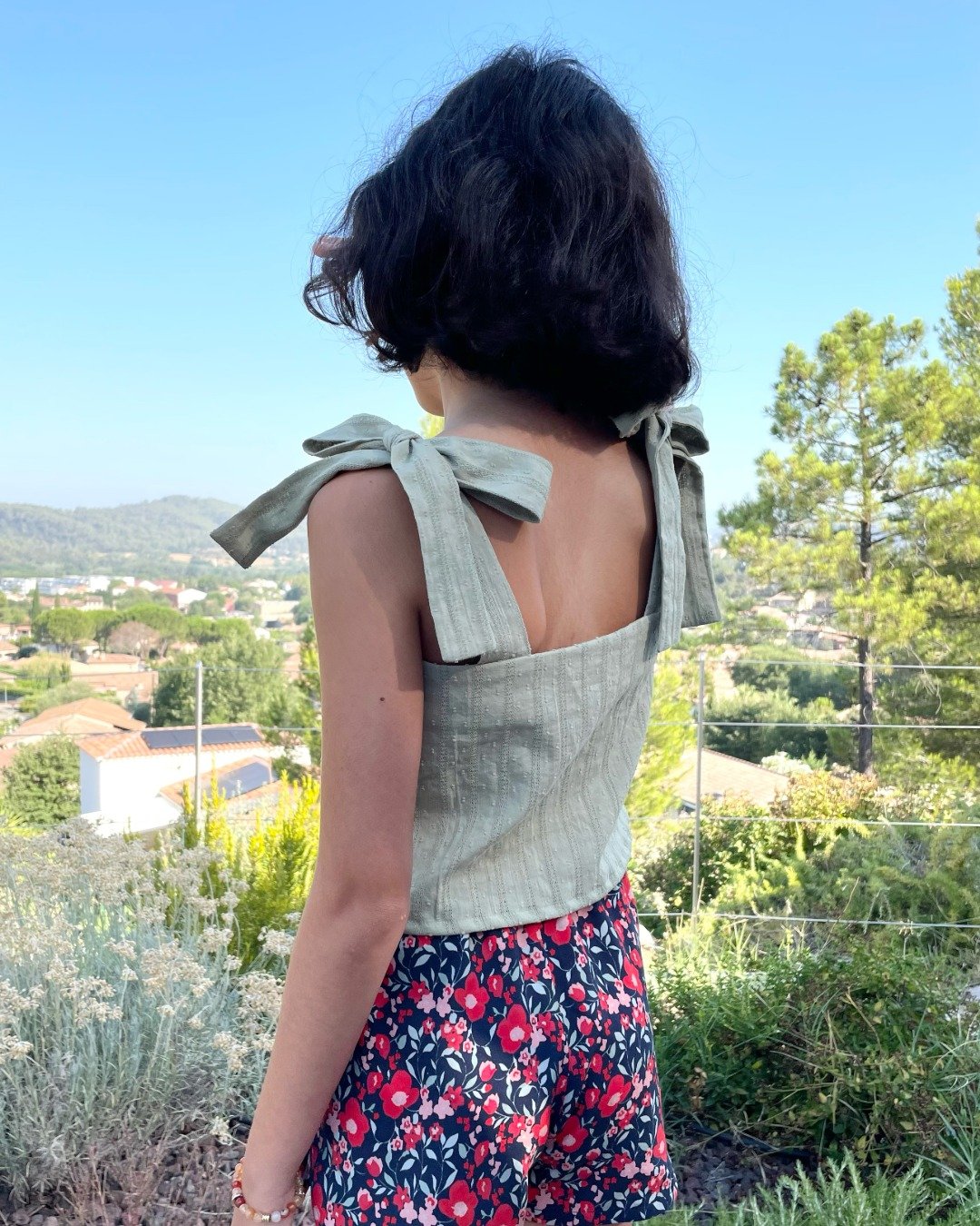 - Bretelles nouées (dans le dos ou sur les épaules) avec possibilité de coudre des bretelles simples si souhaité