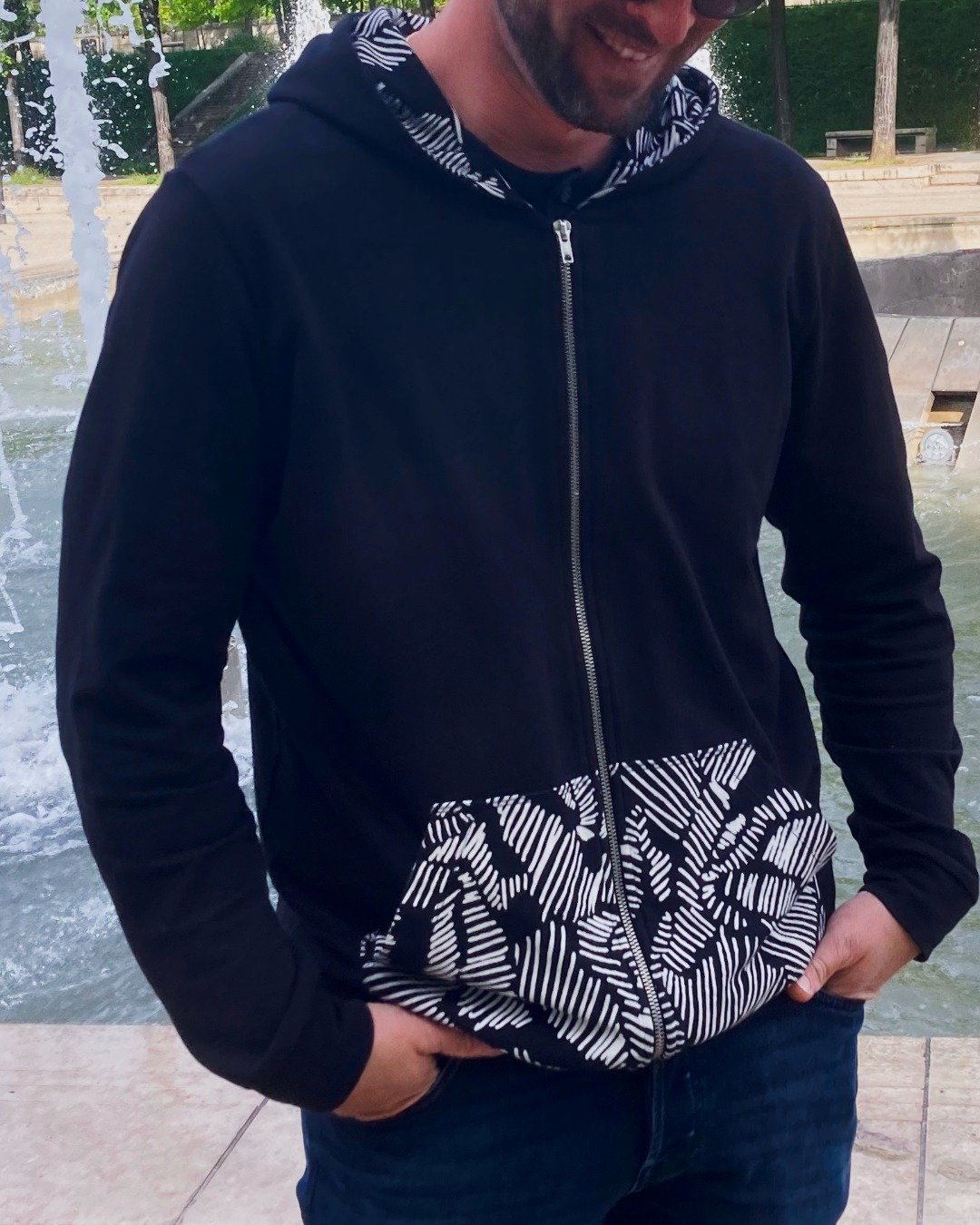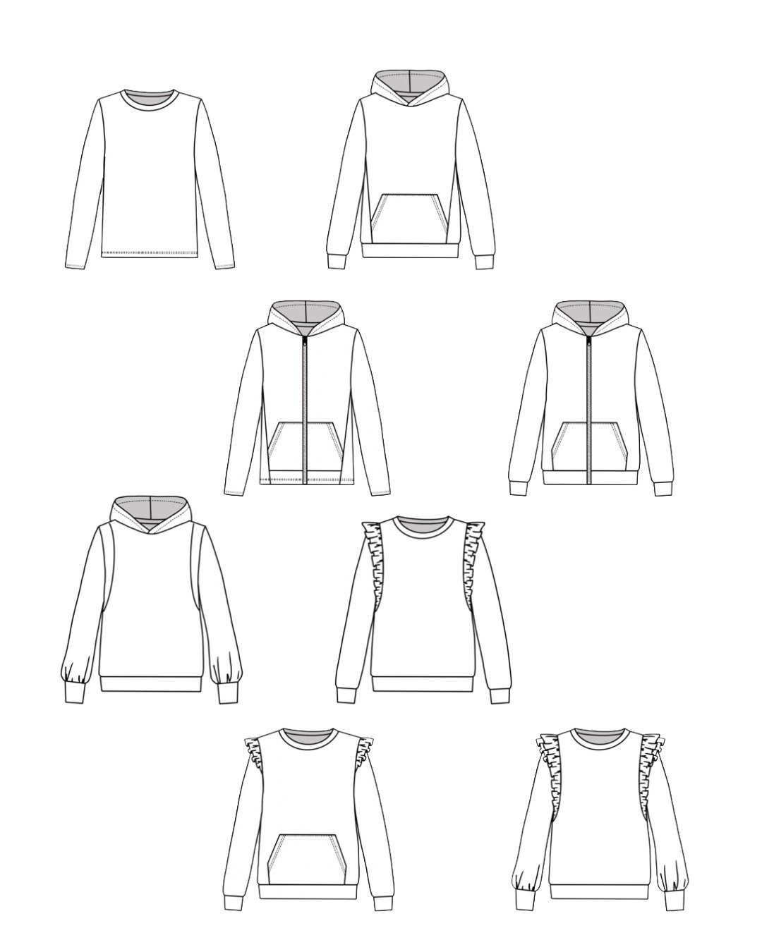- Poche kangourou : version non zippée ou version zippée, avec surpiqûres décoratives possibles
