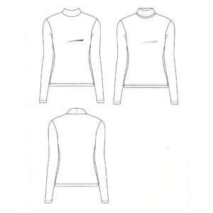 Le Top Alaska est un modèle ajusté prévu pour les tissus extensibles. Il offre deux variations de col : le col cheminée (version A) ou le col roulé (version B), ainsi que deux longueurs : courte (jusqu’au nombril) ou longue (jusqu’aux petites hanches). Disponible du XXS au XXXL, il est facile à coudre et idéal pour les couturières débutantes à intermédiaires.