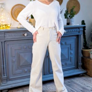 Vous pouvez également opter pour des tissus avec un faible pourcentage d’élasthanne (2 à 5%) pour plus de confort, bien que le patron soit initialement prévu pour des matières non stretch. L’important est de choisir un tissu suffisamment structuré pour maintenir la belle tenue des jambes larges.