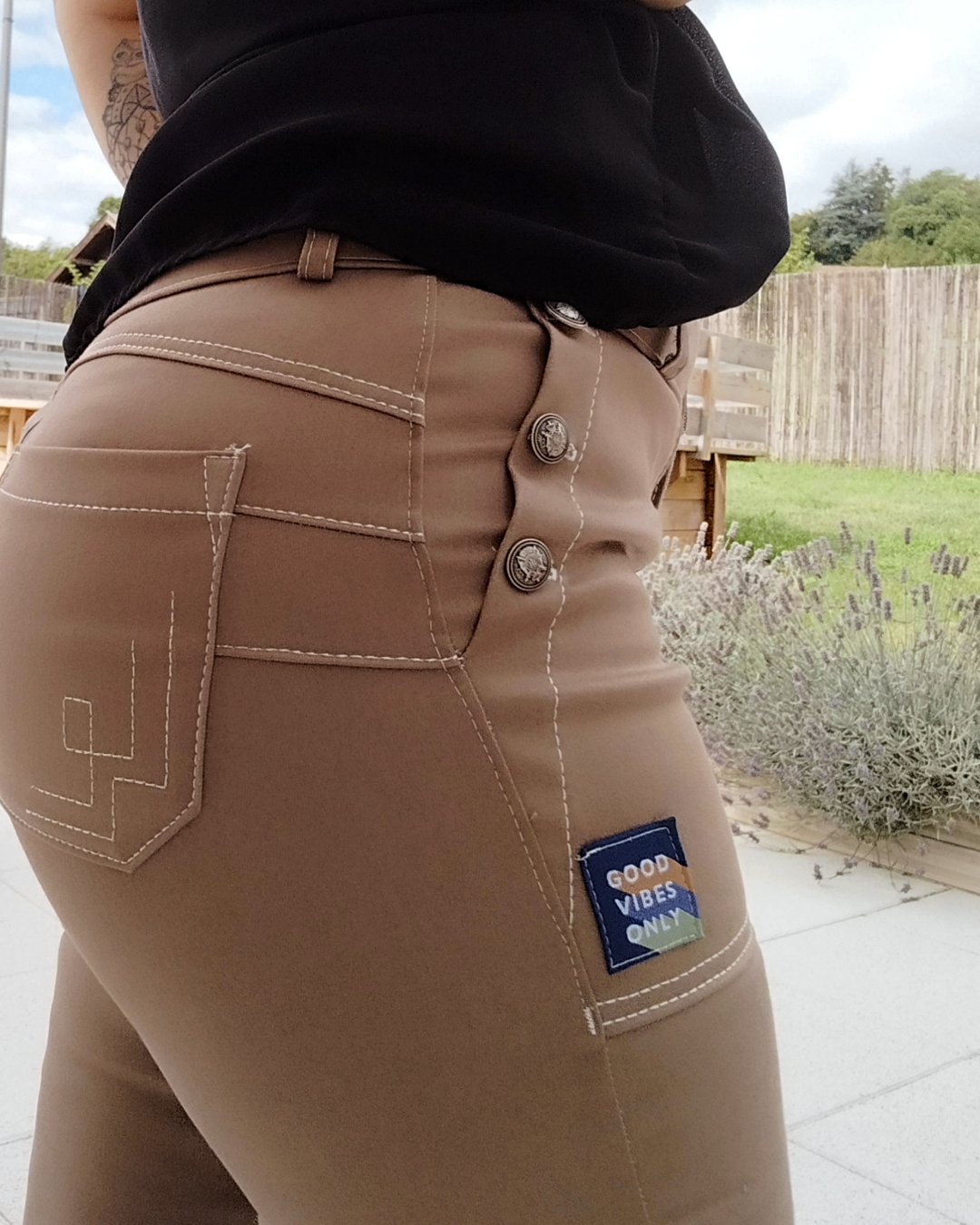 Les tissus conseillés incluent le denim stretch, la gabardine extensible, le coton élasthanne, le twill stretch, ou encore les mélanges coton-élasthanne.